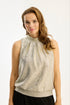 This beautiful top is ideal for festive occasions or when your everyday look needs an elegant boost. The top is sleeveless and made of a lightweight, metallic material that shines in gold and silver tones. The high collar has fine pleat details at the front and closes at the neck with a discreet button.