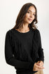 A unique and lovely knit from IN FRONT. This sweater has a round neckline and is designed with beautiful fringe details. The knit also has a wide ribbed hem at the bottom, which ensures a great fit.