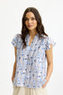 Beautiful and feminine summer blouse in a light and soft quality. The blouse has an upright collar with ruffle details and a small opening at the front, which closes with a button. The short ruffled sleeves give a light and airy look. The fit is loose and comfortable, perfect for warm days.